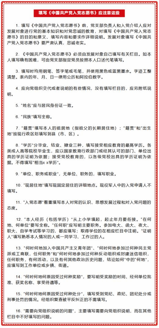 1. 在发展党员常用文书中,入党志愿书是唯一的党组织印发、申请入党人填写的材料。入党志愿有规定的篇幅,不能像其他材料可以不受字数限制地填写。为此,首先要注意字数。