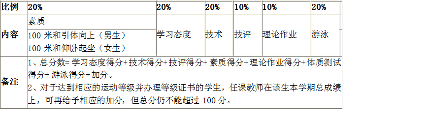 备注 1、总分数=学习态度得分+技术得分+技评得分+素质得分+理论作业得分+体质测试得分+游泳得分+加分。
