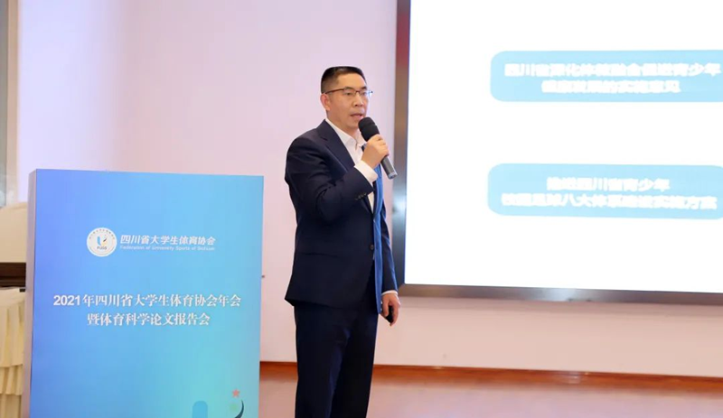 四川省大学生体育协会会长杨远波为协会部门负责人颁发聘书。会上,四川省大学生体育协会副会长邓跃宁宣布科报会论文获奖和课题立项名单。