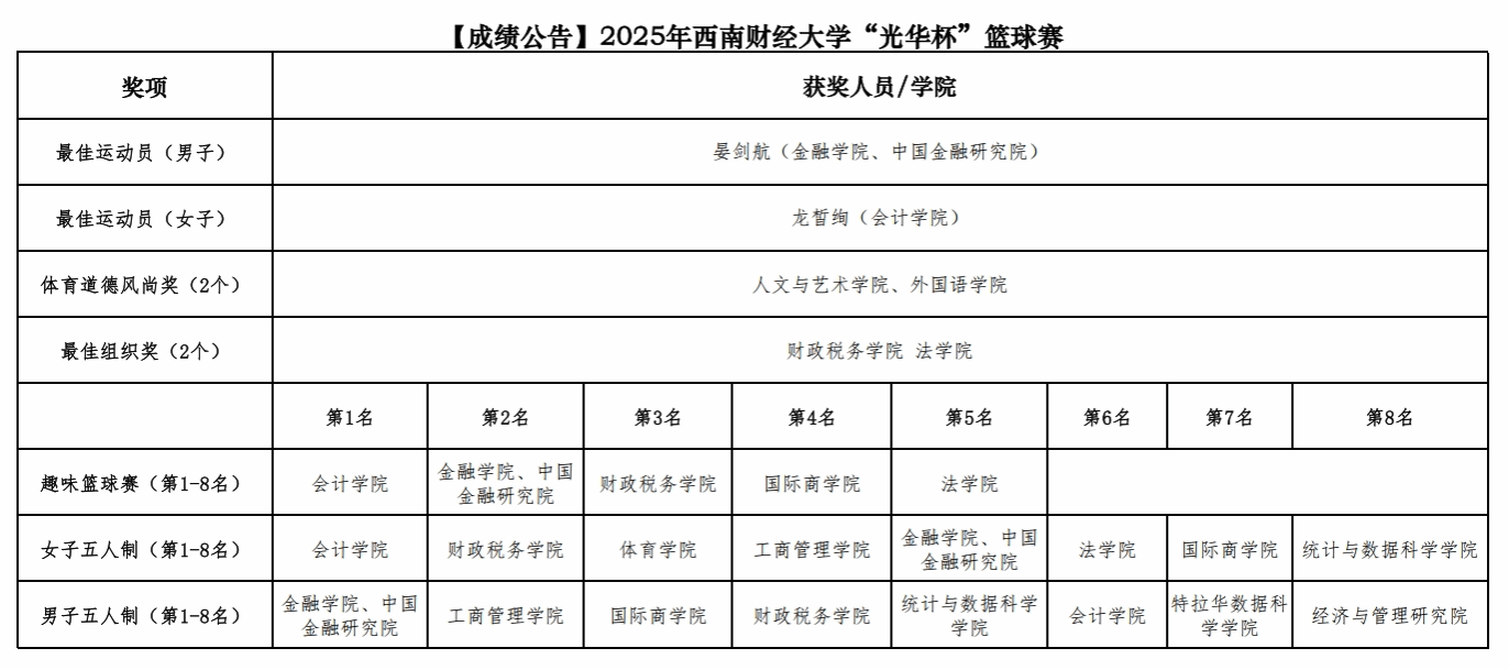 4月15日下午,2025年西南财经大学 “光华杯”篮球赛颁奖仪式在晨曦篮球场举行。心博网页登录_心博(中国)副院长陈丛刊(主持工作)、党委副书记、纪委书记李治及相关部门负责人为获奖学院及个人颁发了荣誉证书及奖牌。